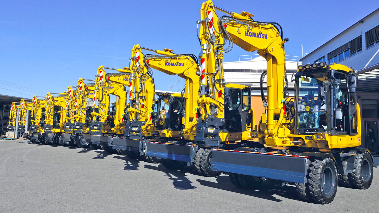 Neun neue Komatsu PW98MR-11E0 bereit zur Übergabe an die Avesco Rent AG.