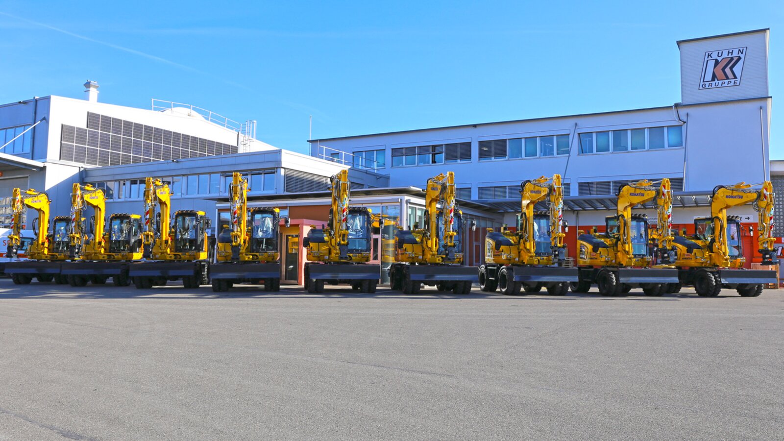 Die neun neuen Komatsu PW98MR-11E0 aufgereiht am Standort von KUHN Schweiz.